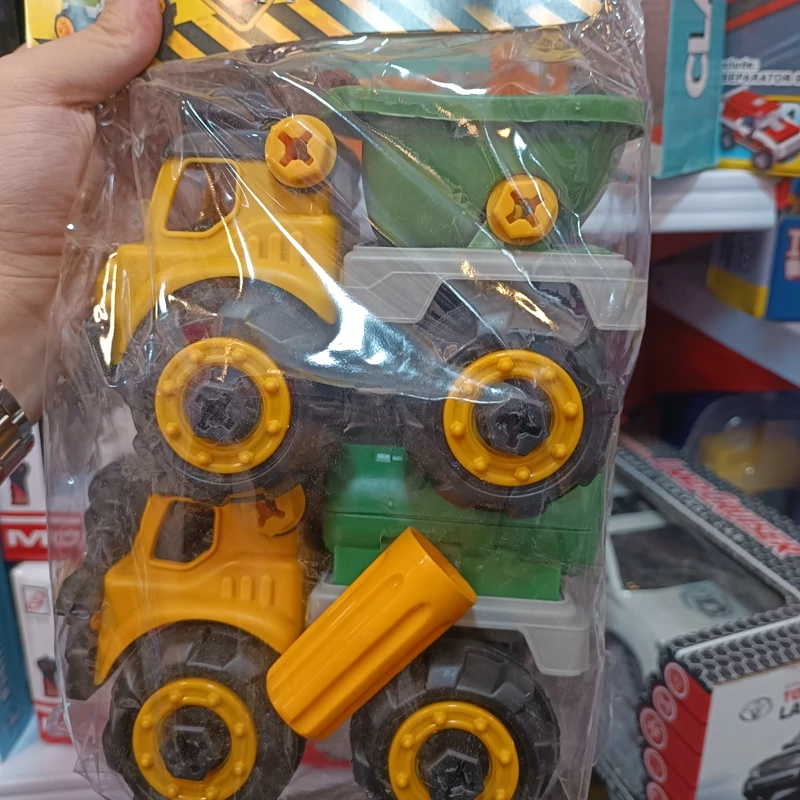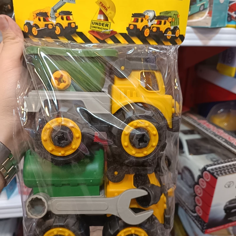 این محصول شامل دو عدد کامیون با طرح های مختلف می باشد که بوسیله پیچ چرخ ها و اتاق جلو و اتاق عقب به بدنه وصل شده اند و به همراه این محصول پیچ گوشتی و آچار هم هست که ساده تر کودکان بتوانند پیچ های ماشین را باز و تیکه های ماشین را جدا و مجدد سر هم کنند